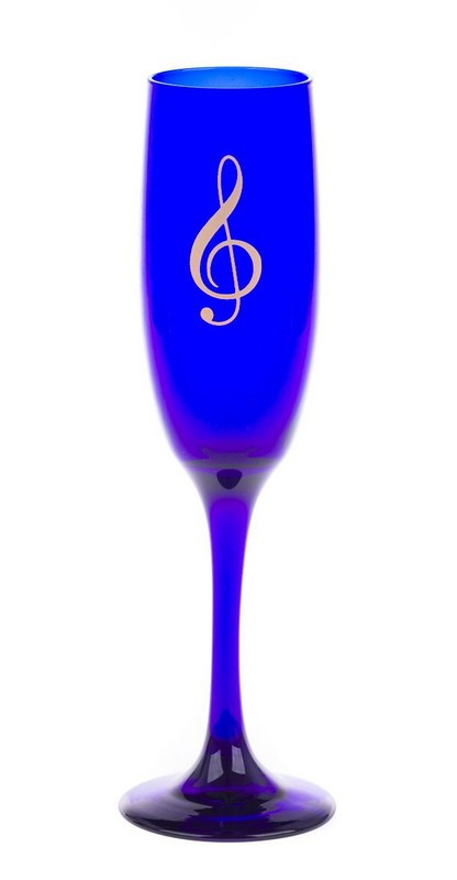 Champagneglas met 22k vergulde vioolsleutel. Kobaltblauw. 22cm hoog en 5cm diameter. Inhoud 125ml.