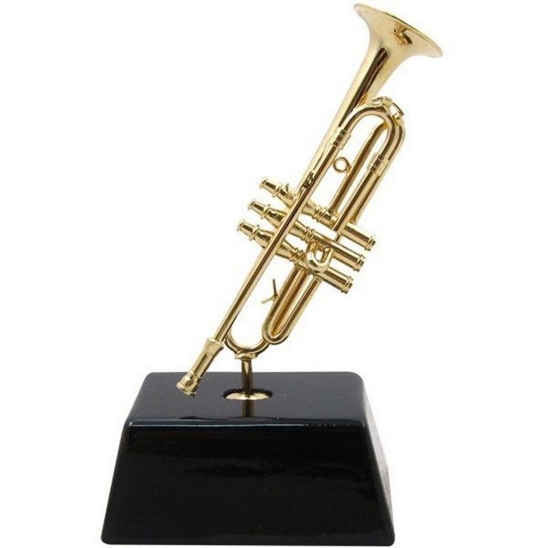 Miniatuurinstrument in vorm van een trompet. Gemaakt van bronskleurig metaal. Ongeveer 9cm groot. Met sokkel.