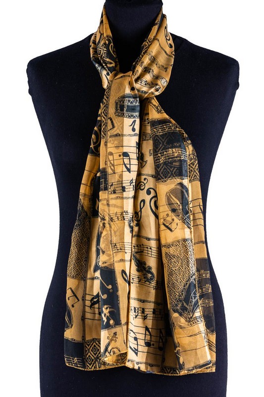 Sjaal goudkleurig met instrumenten en muzieksymbolen. 100% polyester.