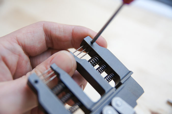 The spring tension of the tool can be adjusted to the density of the hammers making it easier to feel hard areas in the felt. Deficits in hammers originating from the factory voicing can be quickly located and rectified.